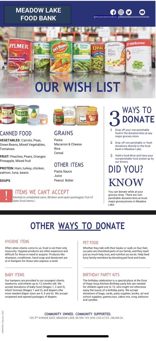 The Meadow Lake Food Bank is a department of Meadow Lake Outreach Ministries.